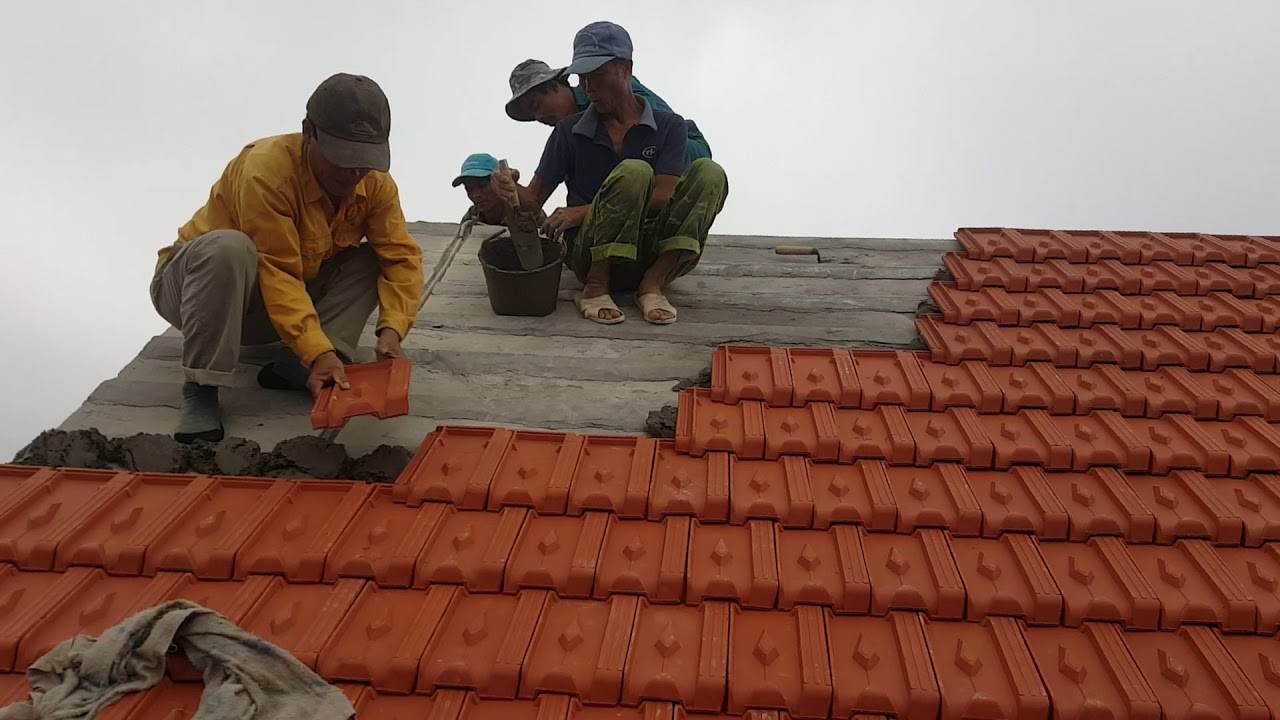– Còn dán lớp vữa xi măng vào mặt trái viên ngói thì cần lợp. Khi thấy vữa đạt được độ cứng phù hợp thì lấy bay cắt bỏ phần thừa đi và làm nhẵn sau đó dán ngói lên sàn bê tông. Lưu ý các hàng ngói bê tông thì không cần phải dán chồng lên nhau. Cứ khoảng 2/3 chiều dài viên ngói để đảm bảo mái ngói luôn được chồng khít lên nhau.